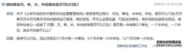 关于《北京市消防技术服务机构监督管理系统》维保使用过程中,月检、季检、半年检、年检,是否可以不按:月月季月月半月月季月月年的顺序进行维保,有时进场,甲方让全面检查,可能会发季检,有时消电检做联动测试,维保年检就让一起做了问题:月、季、半、年检顺序是否可以打乱?是否是一年做够2个季检、一个半年检、一个年检、其余月检就可以么?